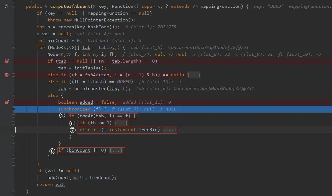 现在 “AaAa” 就等着这个 computeIfAbsent 操作的返回值,然后进行下一步操作,也就是进行标号为 ③ 的操作了。
