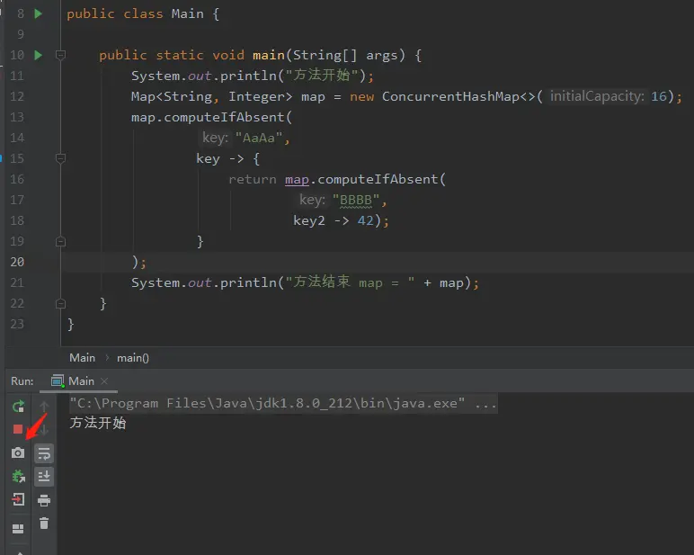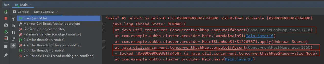 问题在于我们在进行 computeIfAbsent 的时候,里面还有一个 computeIfAbsent。而这两个 computeIfAbsent 它们的 key 对应的 hashCode 是一样的。