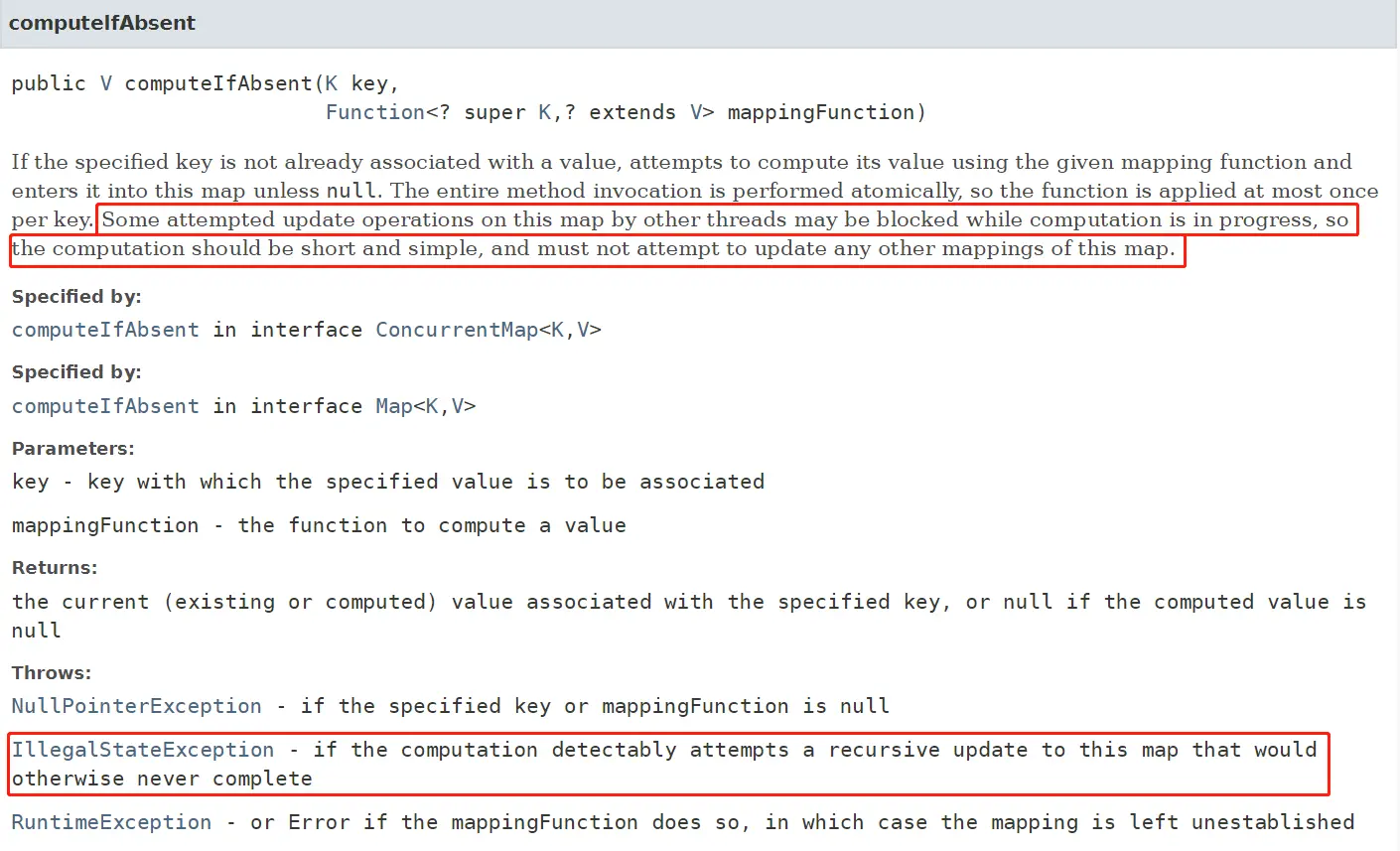 这就是递归调用,我用 JDK 1.8 跑的时候并没有抛出 IllegalStateException,只是程序假死了,原因和我们前面分析的是一样一样的。我理解这个地方是和文档不符的。