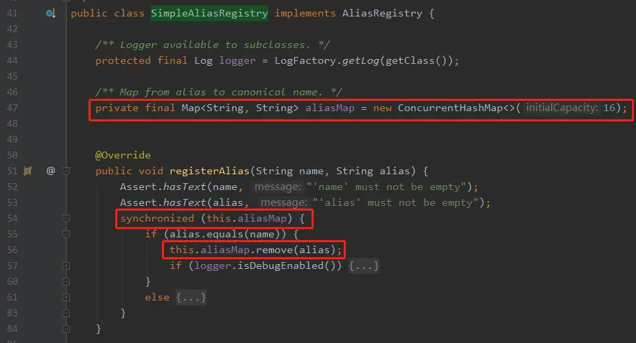 在这个类中,aliasMap 是 ConcurrentHashMap 类型的: