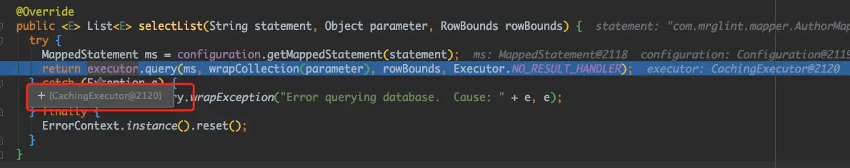 可以看到这里的 Executor 对象是 CachingExecutor,那么二级缓存的流程是由它负责的吗?继续跟进看个究竟。
