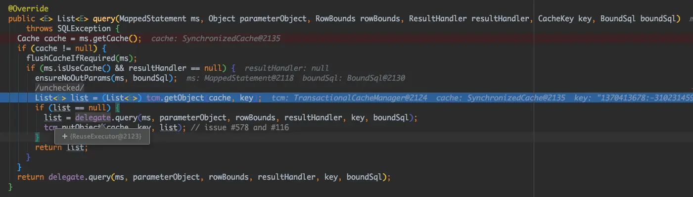 最终,在以下代码中可以发现,在 CachingExecutor 内部中,会首先通过它的成员变量 tcm 的 getObject 获取数据,当获取到的数据为null时,才会通过其成员变量 delegate 进行数据库查询,这里的 delegate 就是 ReuseExecutor 对象。