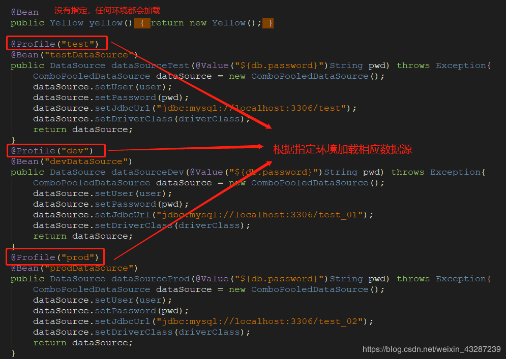 @Profile:指定组件在哪个环境的情况下才能被注册到容器中,不指定,任何环境下都能注册这个组件- 加了环境标识的bean,只有这个环境被激活的时候才能注册到容器中。默认是default环境