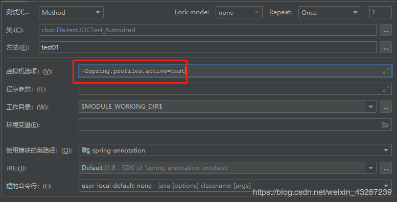 切换环境1)使用命令行动态参数: 在虚拟机参数位置加载 -Dspring.profiles.active=test