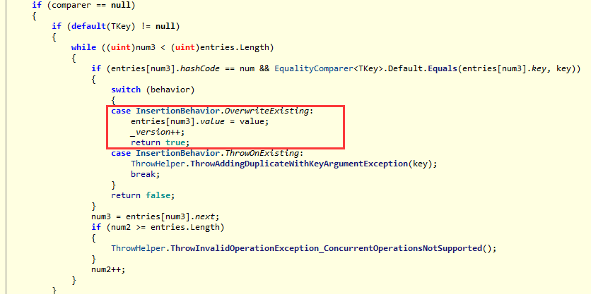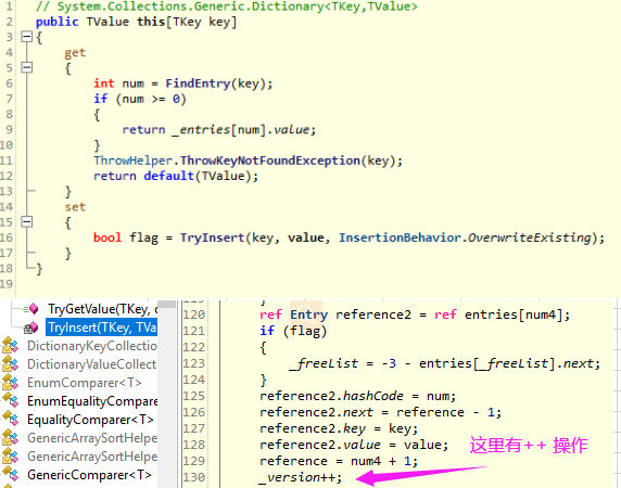 从图中可以看到,当每次执行moveNext的过程中,都会判断一下字典的 version 和 当初初始化迭代类中的version 版本号是否一致,如果不一致就抛出异常,所以这行代码就是点睛之笔了,当在foreach体中执行了 dict[userid] = dict[userid] + 1; 语句,相当于又执行了一次类索引器操作,这时候字典的version就变成 4 了,而当初初始化迭代类的时候还是3,自然下一次执行 moveNext 就是 3 != 4 抛出异常了。