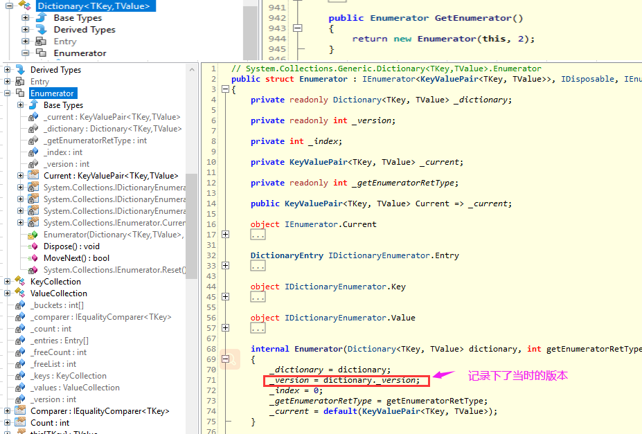 从图中可以看到,每一次的索引器操作,这里都执行了version++,所以字典初始化完成之后,这里的 version=3,没有问题吧,然后继续看代码,寻找 Dictionary.GetEnumerator 方法启动迭代类。