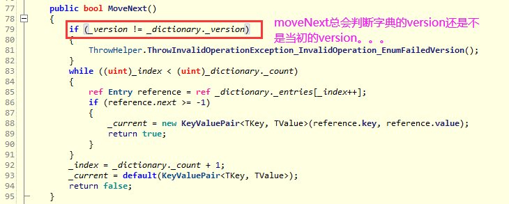 上面代码的 _version = dictionary._version; 一定要看仔细了,在启动迭代类的时候记录了当时字典的版本号,也就是_version=3,然后继续探索moveNext方法干了什么,如下图: