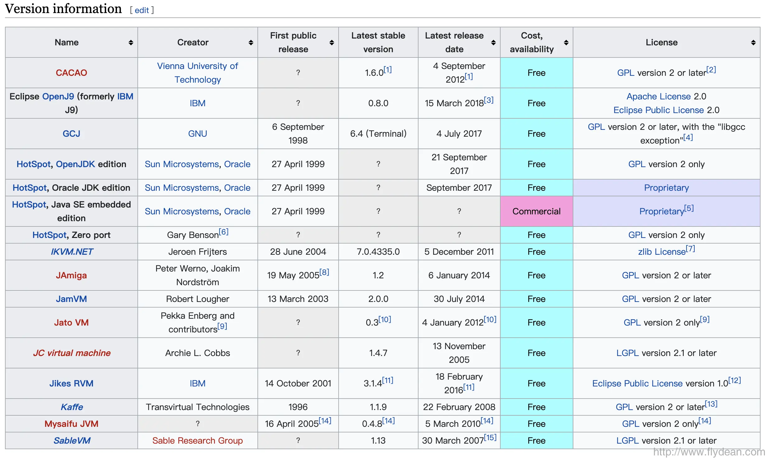 下面是我在维基百科中截取到的目前各个JVM的比较:
