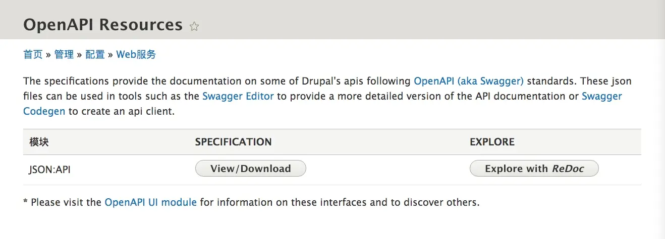 该模块通过在Drupal和库之间提供集成以显示api规范供开发人员和最终用户使用,从而适合OpenAPI生态系统。有关Drupal api的OpenAPI规范以及其他贡献模块的API的信息,请查看OpenAPI模块。