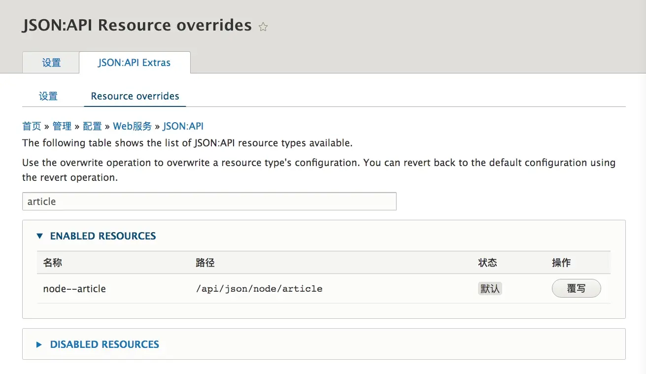 /admin/config/services/jsonapi/extras页面来设置。需要进行资源覆写点击Resource overrides按钮。