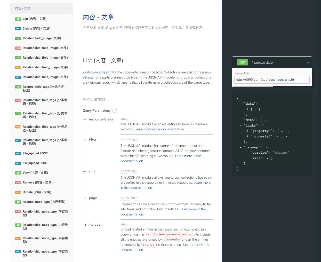 与基本的Open API模块集成以生成JSON:API的定义。如果您需要由JSON:API驱动的API的文档,则需要启用此模块和文档生成器,例如Open API UI ReDoc。请查看Open API项目,以获取有关替代UI生成器的更多信息。
