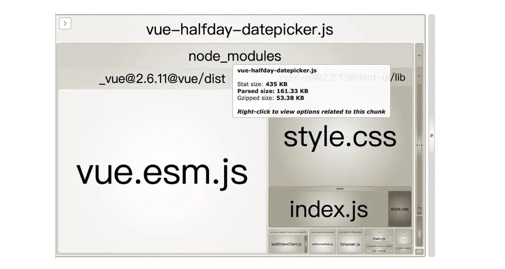 执行 npm run dev,看到打包后的插件的各个模块的大小。我们发现插件把 vue 打包进去了,是因为 mint-ui 引入了 vue。插件大小,Parsed size: 161.33kb。