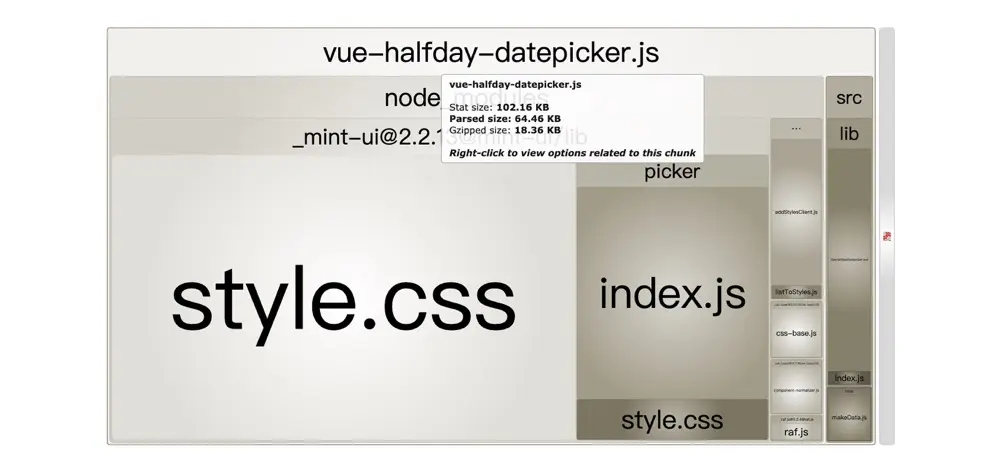 一个vue插件基本上就开发好了,我们想看看构建生成的插件各个模块的大小,有哪些可优化的空间,可以借用 webpack-bundle-analyzer 可视化工具查看。 在项目根目录下使用命令行 cnpm i webpack-bundle-analyzer,去 webpack.config.js 中配置