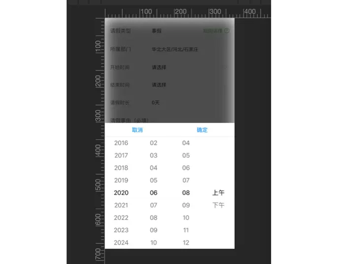 我们先来看看,这次造的什么轮子,针对我们请假审批的需求,请假的时候选择日期选择器是带上下午的,这在移动端并不多见,通常是日历的形式,我们的产品要求picker滚动器的形式。找了半天都没找到合适的。