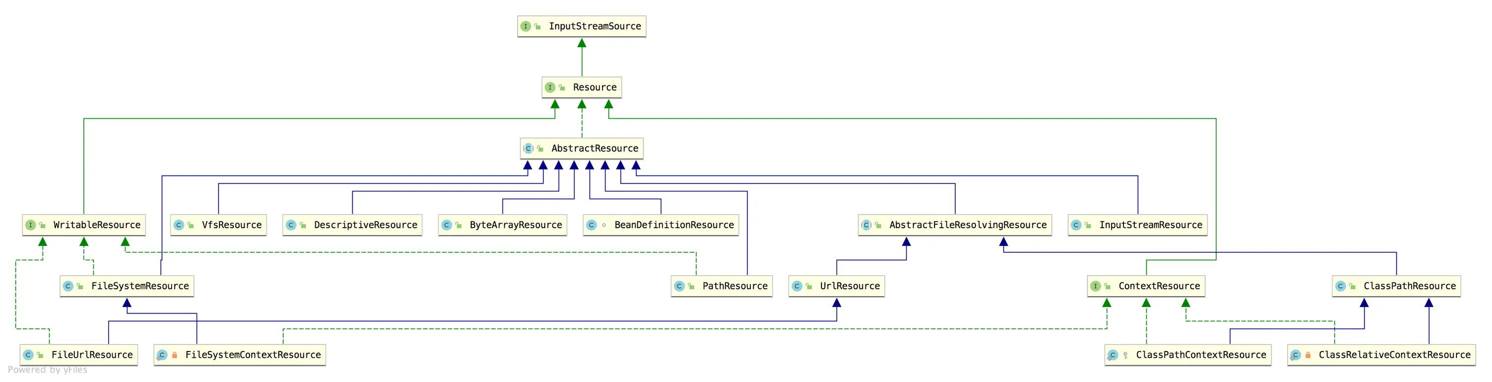 - Resource 接口实现了 InputStreamSource 接口,并且封装了 Spring 内部可能会用到的底层资源,如 File、URL 以及 classpath 等。