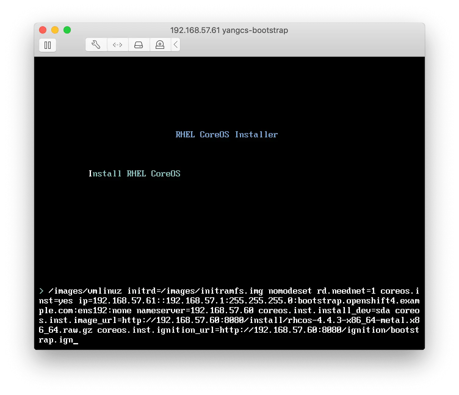 ip=192.168.57.65::192.168.57.1:255.255.255.0:worker1.openshift4.example.com:ens192:none nameserver=192.168.57.60 coreos.inst.install_dev=sda coreos.inst.image_url=http://192.168.57.60:8080/install/rhcos-4.4.3-x86_64-metal.x86_64.raw.gz coreos.inst.ignition_url=http://192.168.57.60:8080/ignition/worker.ign