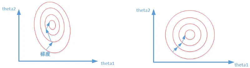 左图为标准化之前,右图为标准化之后,可以看到标准化可以让模型少走很多弯路,从而加快收敛速度,这一点也很容易想象,毕竟个位数与千位数、个位数与个位数之间的"距离"差距还是很大的。