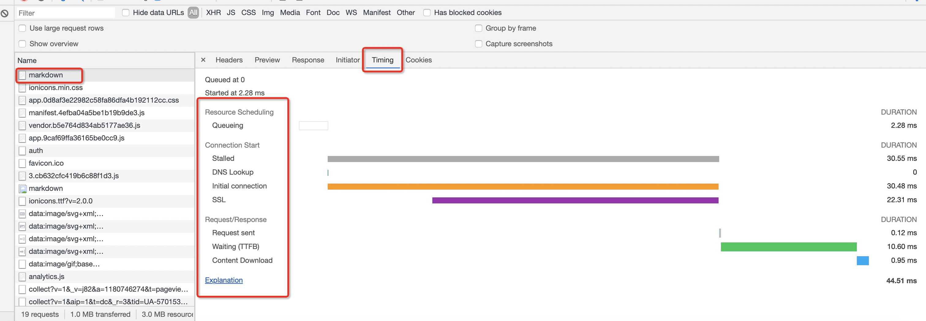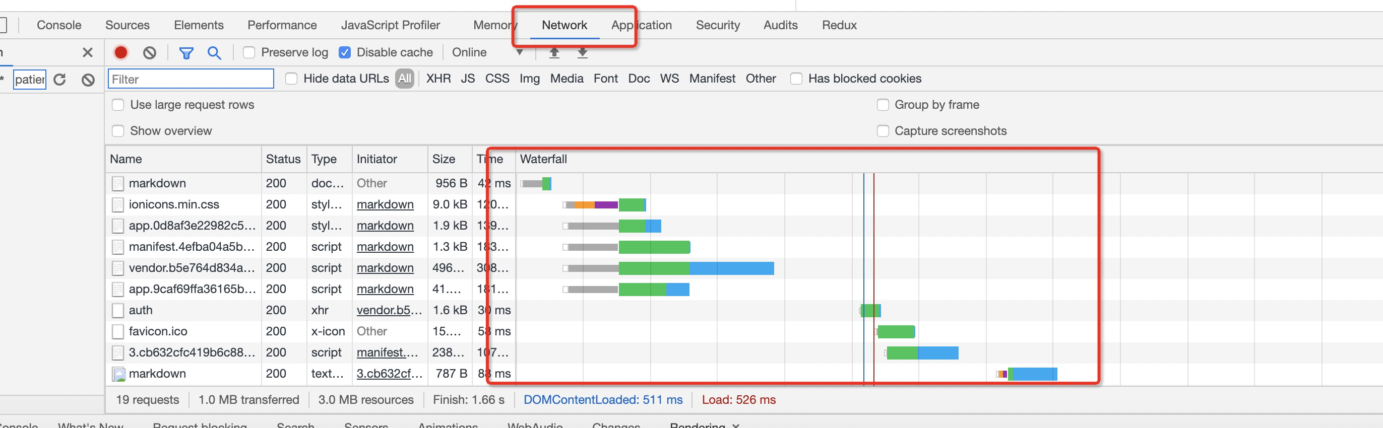 Network中的瀑布流显示了其信息