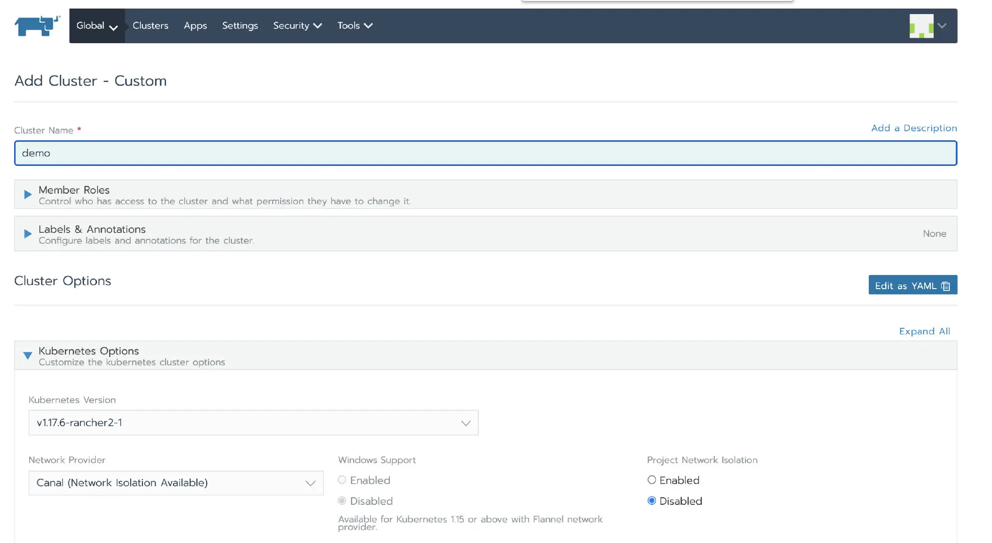 登录 Rancher UI 后,添加一个自定义集群