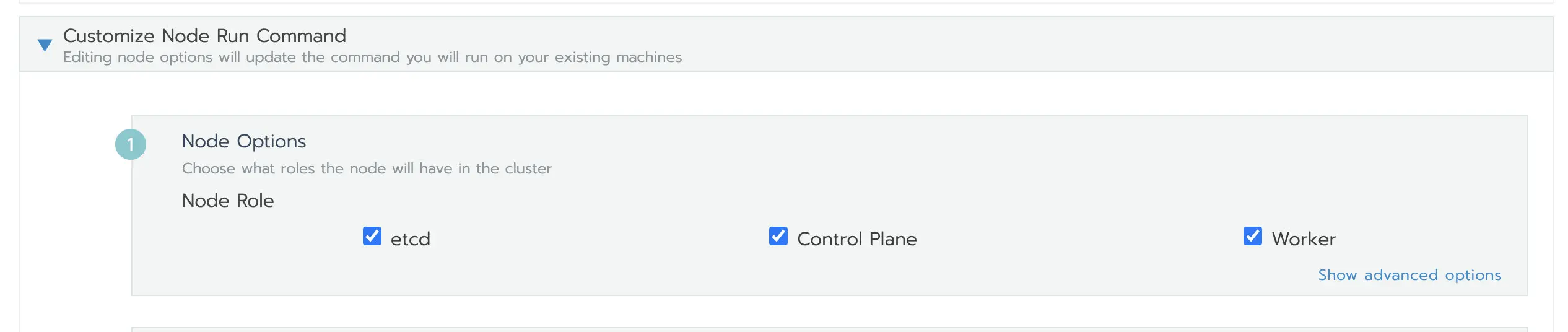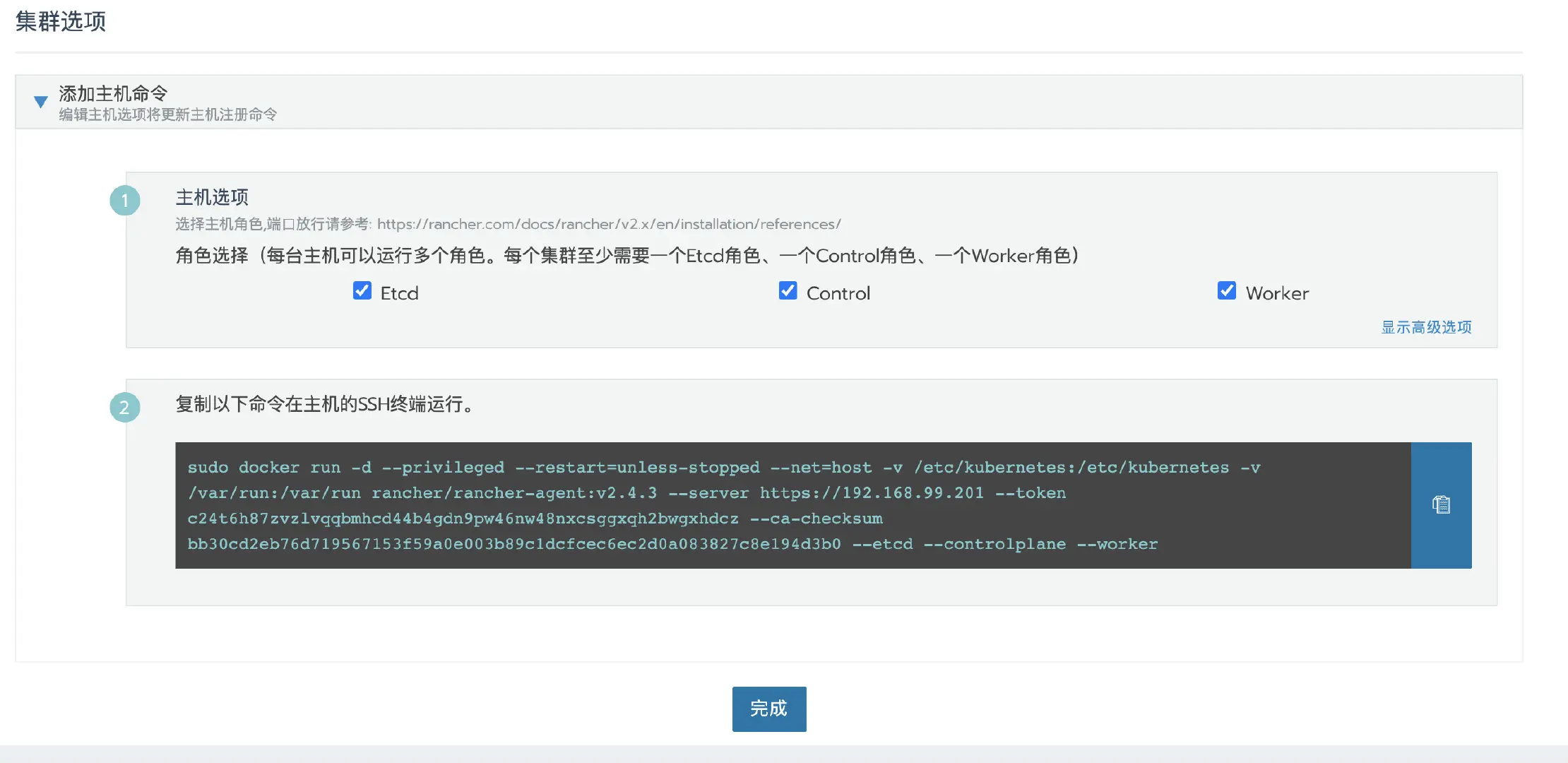 点击下一步,根据预先分配的节点角色选择需要的角色,然后复制命令到主机终端执行。