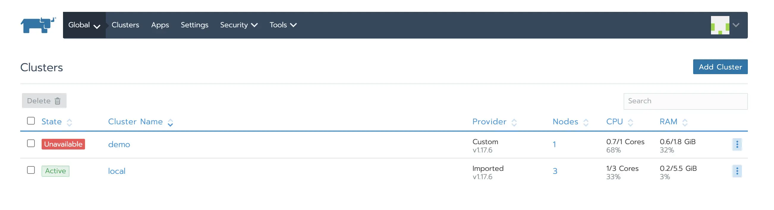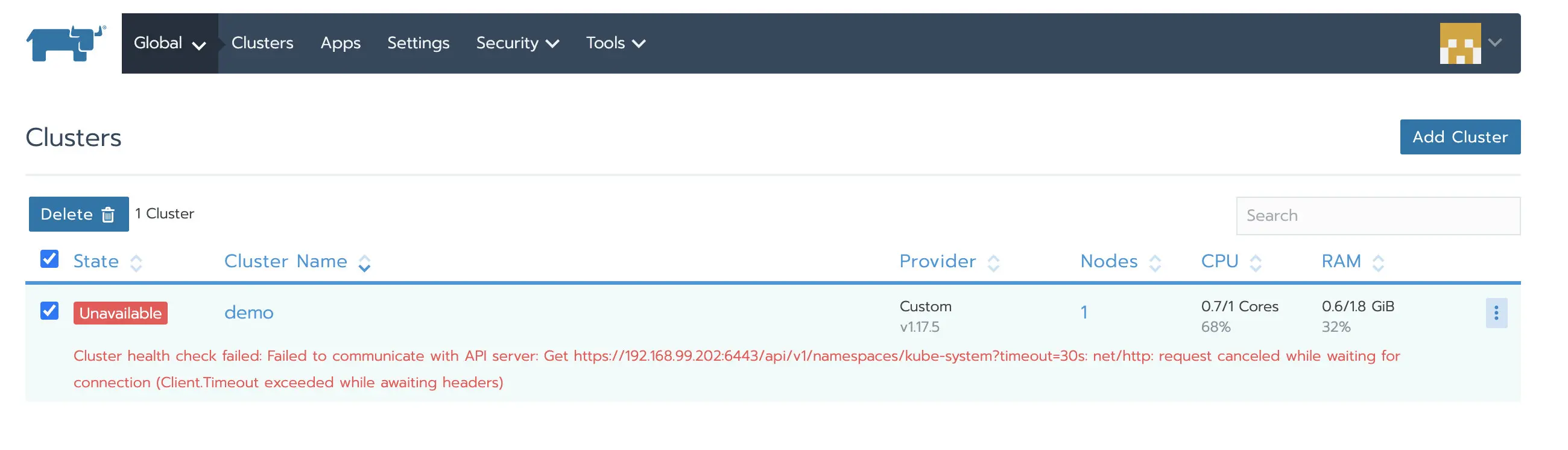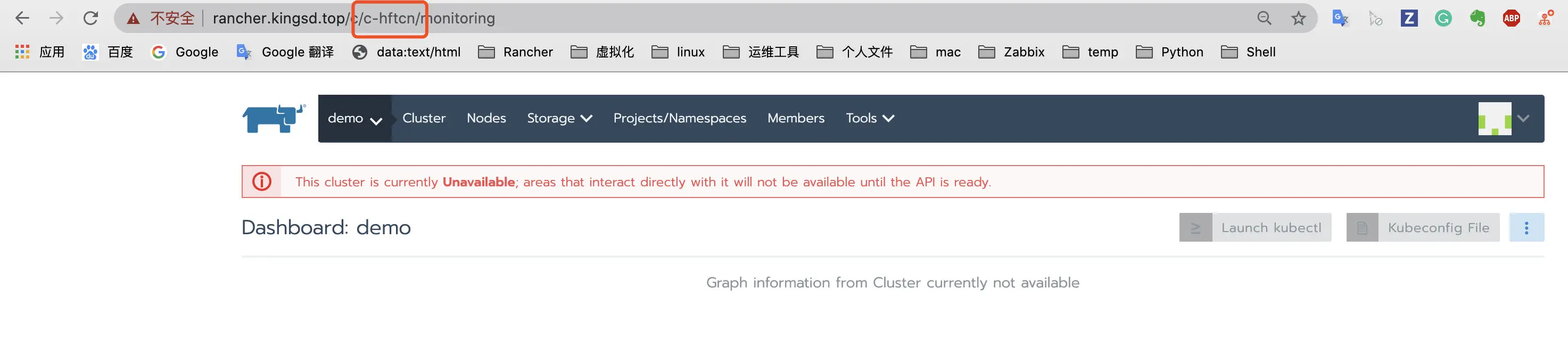 此时访问新的Rancher Server就可以看见已经被管理的Kubernetes集群了,但此时集群状态是unavailable,因为agent还连的是旧Rancher Server所以需要更新agent信息。