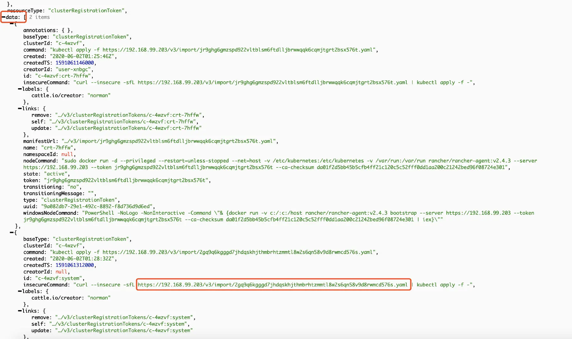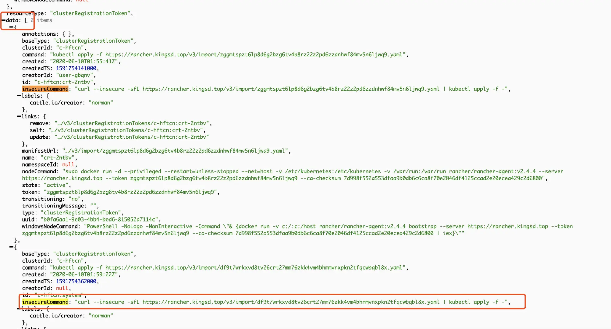 "baseType": "clusterRegistrationToken",如上图。这种情况以createdTS最大、时间最新的一组为准,一般是最后一组。