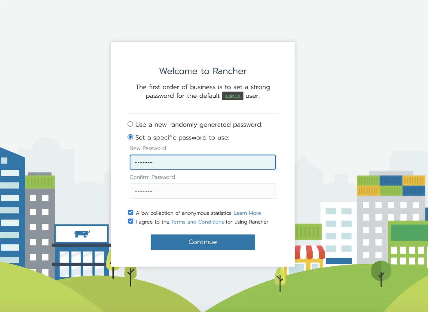 等容器初始化完成后,通过节点 IP 访问 Rancher Server UI,设置密码并登录。