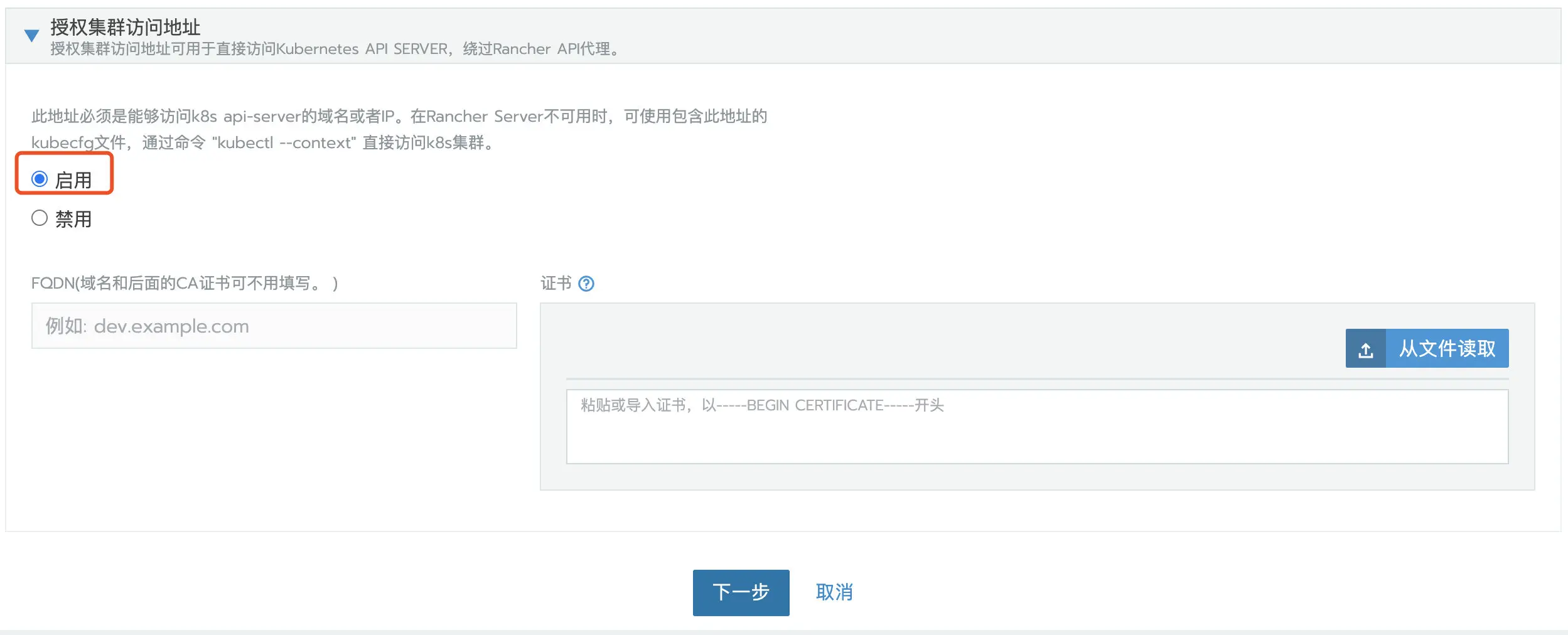 授权集群访问地址设置为启用,FQDN 和证书可以不用填写。