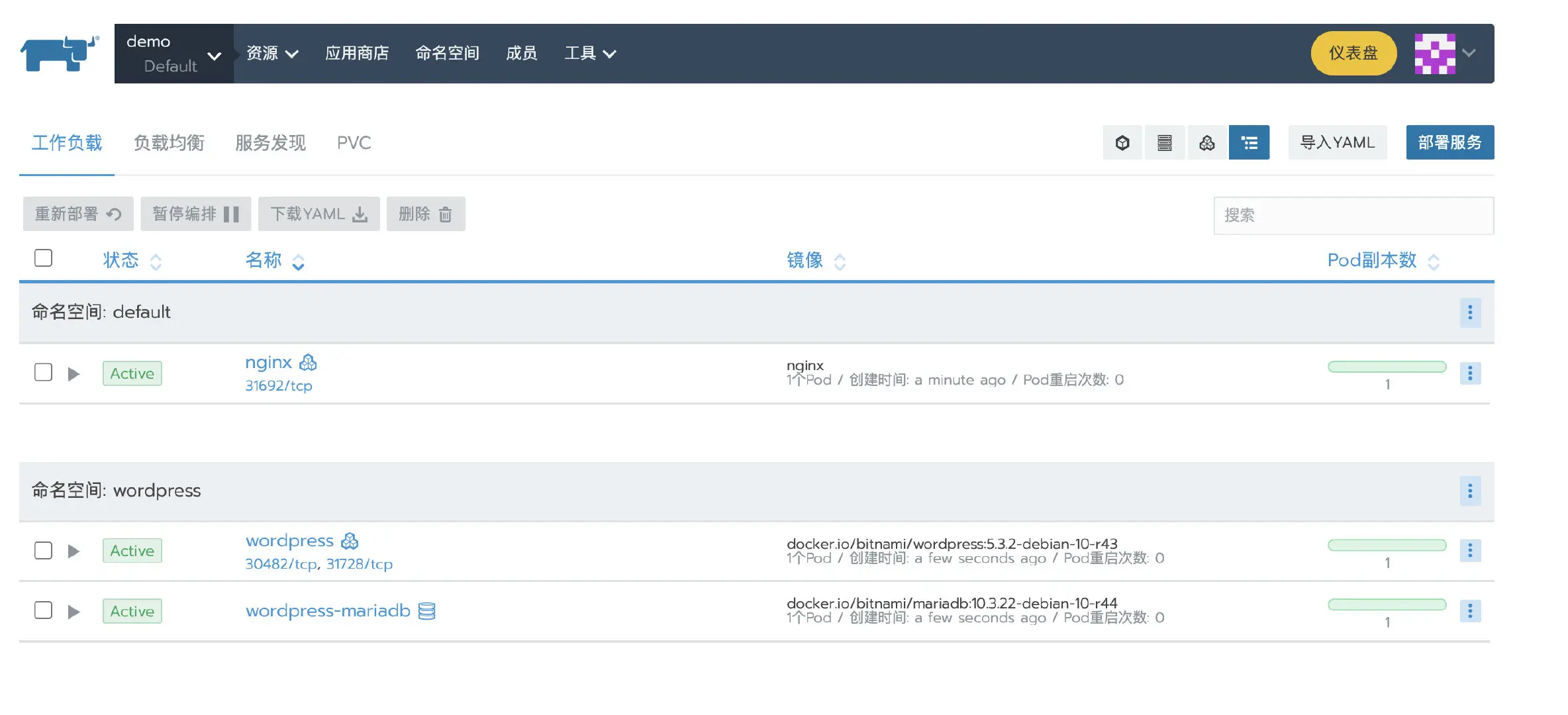 部署一个nginx workload。再从应用商店部署一个测试应用。