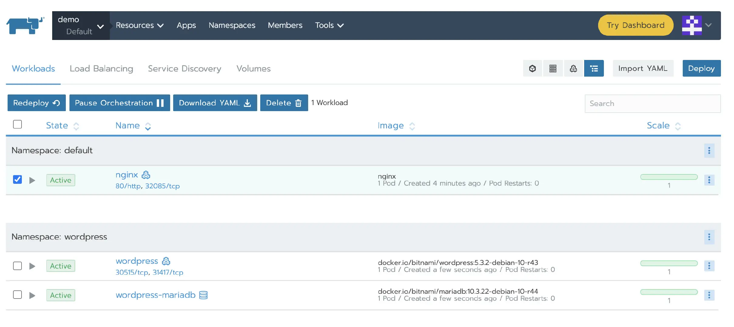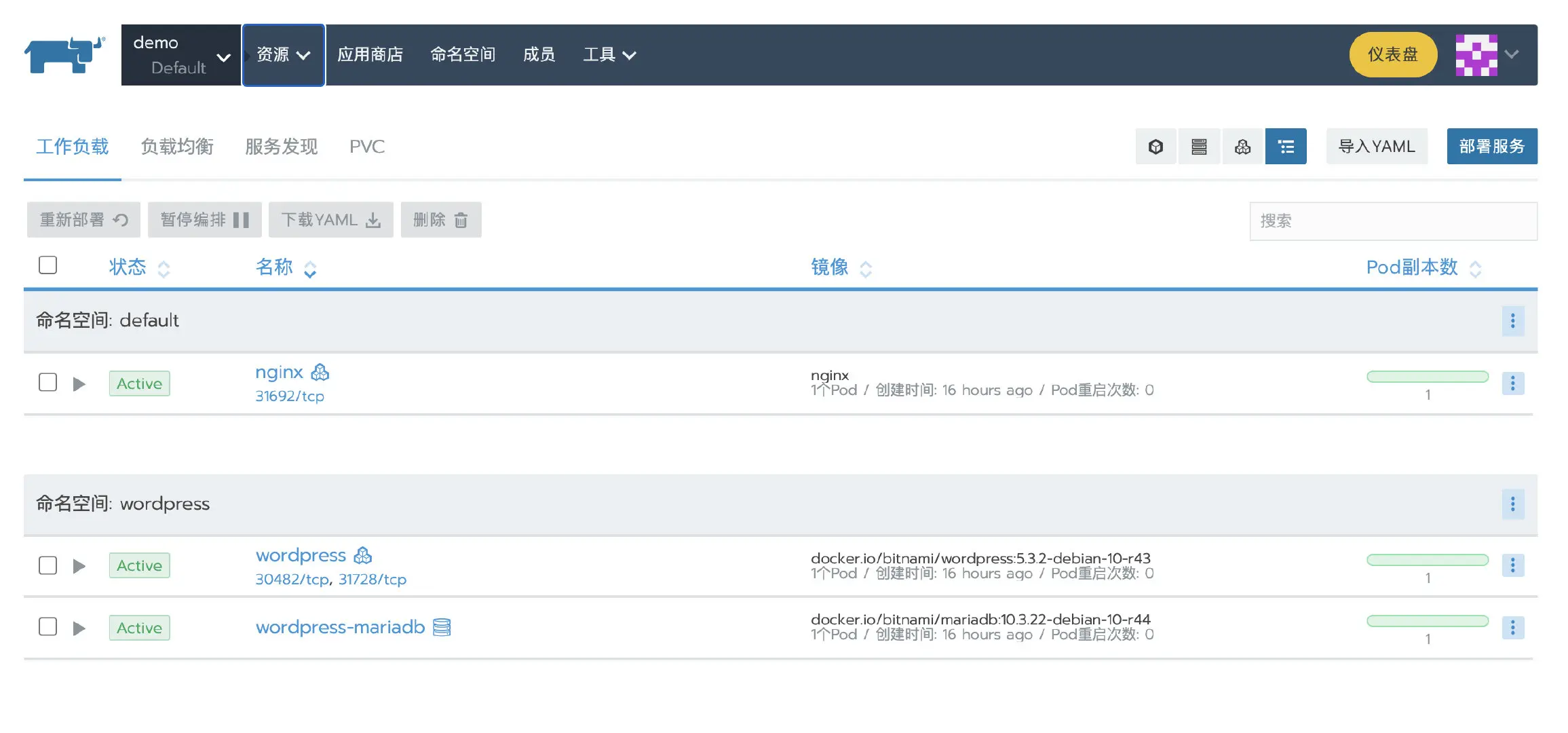 等待测试集群添加成功后,部署一个nginx workload。再从应用商店部署一个测试应用。