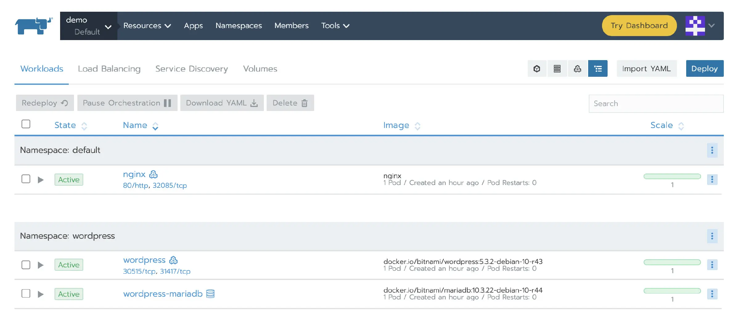 提示: 以下步骤创建用于演示的业务集群,用来验证 Rancher 迁移后数据是否丢失,如果您需要迁移正式环境可以跳过此步骤。