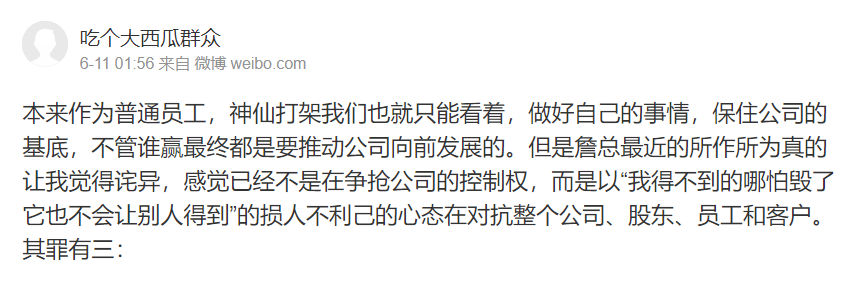 比特大陆抢夺营业执照后续事件可谓新瓜不断,战火也终于烧到了员工身上。近日,有员工发长微博控诉抢夺营业执照主角之一的詹克团,列举其“三宗罪”,引发众多比特大陆内部员工共鸣。
