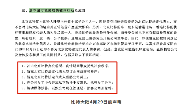 据悉,自詹克团申请行政复议恢复比特大陆工商登记法人以来,可谓动作频频。先是向比特大陆CFO、前法人代表刘路遥下发了“解除劳动关系通知”,后又向人力资源部和财务部门下发一系列通知;之后更是派人撬锁闯进北京比特大陆办公区,并发布声明称已更换新公章,旧公章作废;日前,詹克团又向员工发布复工通知,称本月打卡不足13天不发放当月薪资;甚至还有网传詹克团禁止员工给已付费客户正常发货,造成比特大陆矿机部门运营出现问题,并以法人身份签订销售代理协议……这一系列“神”操作,倒是一一应验了之前比特大陆官方曾发布的一则声明。