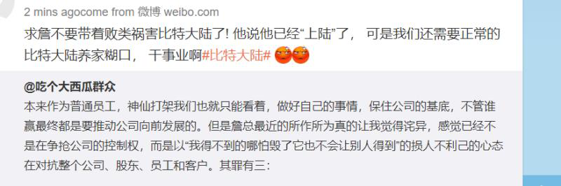 对此,有员工在微博发表评论,“求詹不要带着败类祸害比特大陆了,我们需要正常的比特大陆养家糊口”;还有员工表示,“比特大陆再这么闹一个月,估计后面需要用两年追赶竞争对手”等,无一不体现出员工对自己和公司未来的担忧。