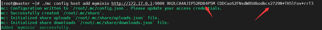 ./mc config host add myminio http://172.17.0.1:9000 XH2LCA4AJIP52RDB4P5M CDDCuoS2FNsdW8S0bodkcs2729N+TH5lFov+rrT3