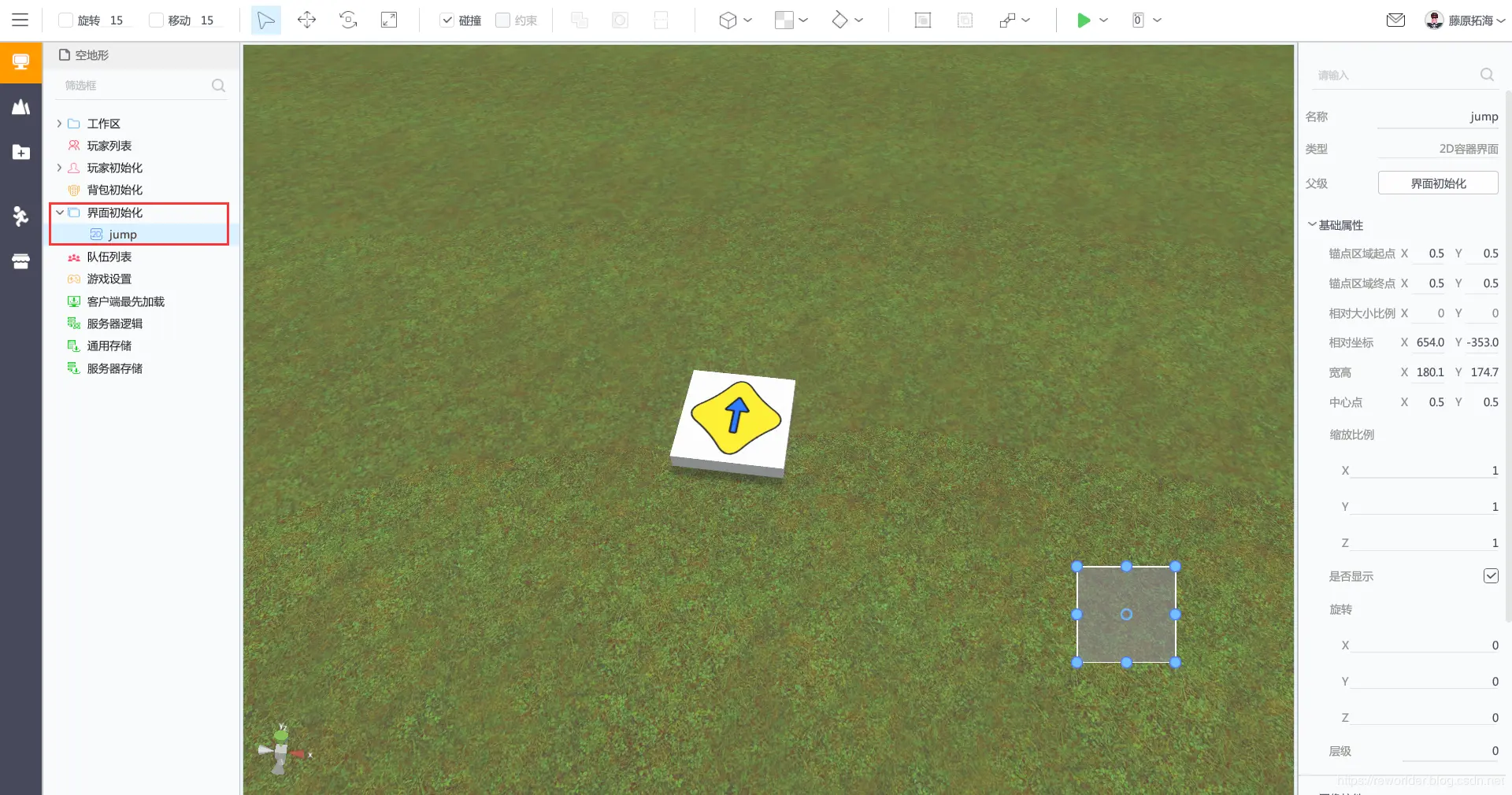 一、蓄力跳按钮搭建过程 1.首先我们需要在界面初始化里创建一个2D容器界面,重命名为jump。如下图所示: