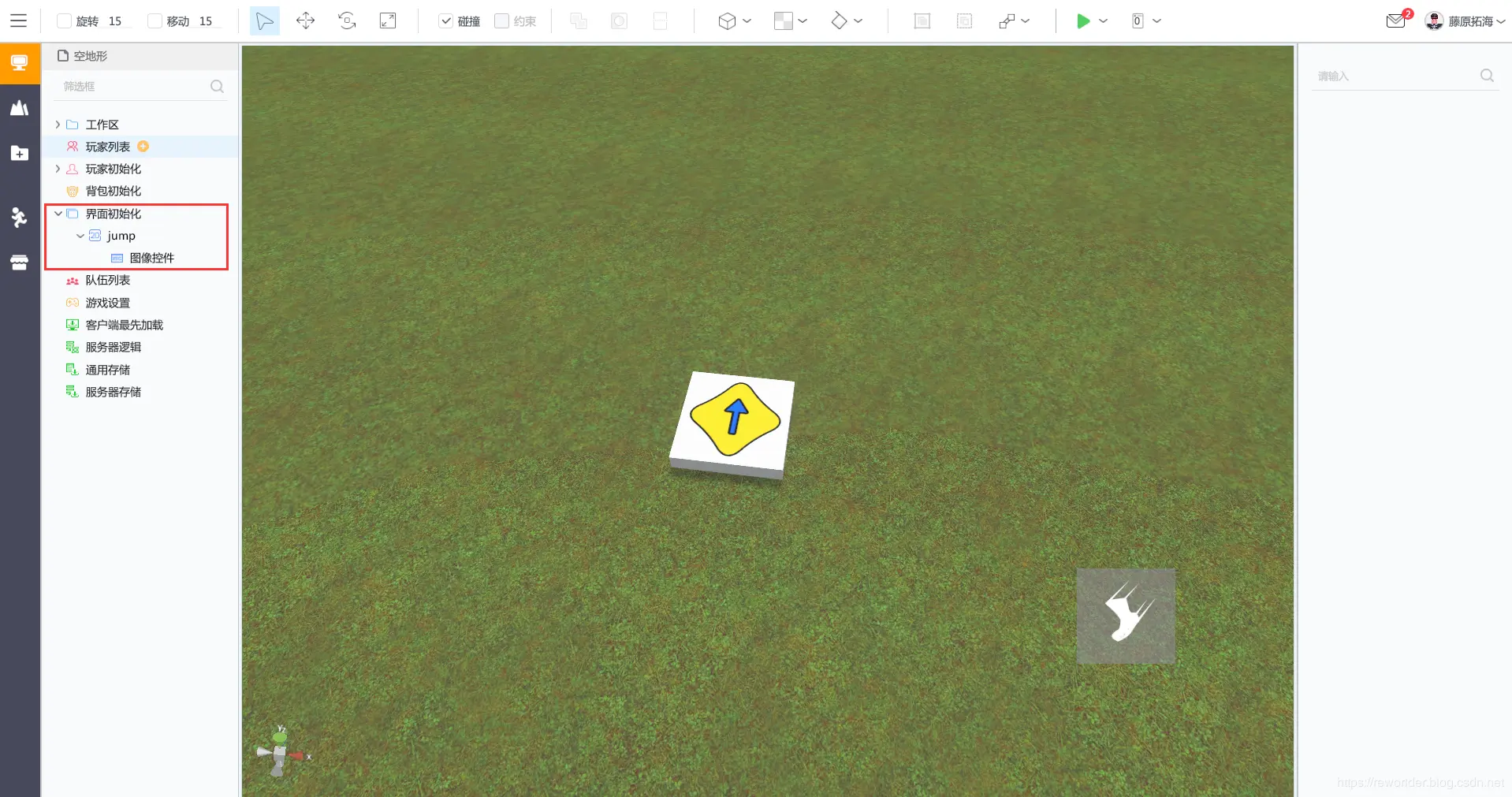 想要实现一个蓄力跳跃的功能,我们就需要获取到玩家点击蓄力跳跃按钮的时间,然后根据这个时间来修改玩家的跳跃速度。因此我们首先需要创建一个蓄力跳跃的UI,通过客户端脚本来实现这个功能。