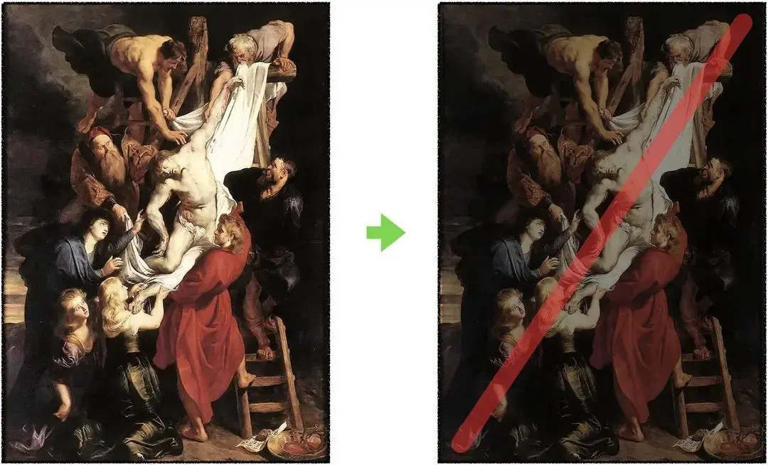 如果梵高的《加歇医生像》需要推测的话,那这一幅彼得·保罗·鲁本斯的《耶稣下十字架》就很明显了,一个典型的对角结构。