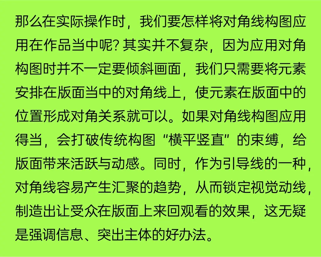 因为对角线是整个矩形版面中最长的直线,它能够带领受众非常自然的看完整个画面。
