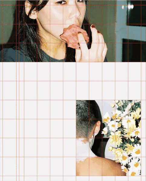先将网格绘制出来,然后在版面的左上角与右下角分别放置一张图片。