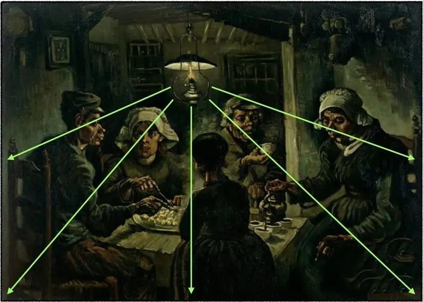 比如梵高的《食土豆者》就使用了「放射形」构图,放射线从吊灯处向四周发散开来。