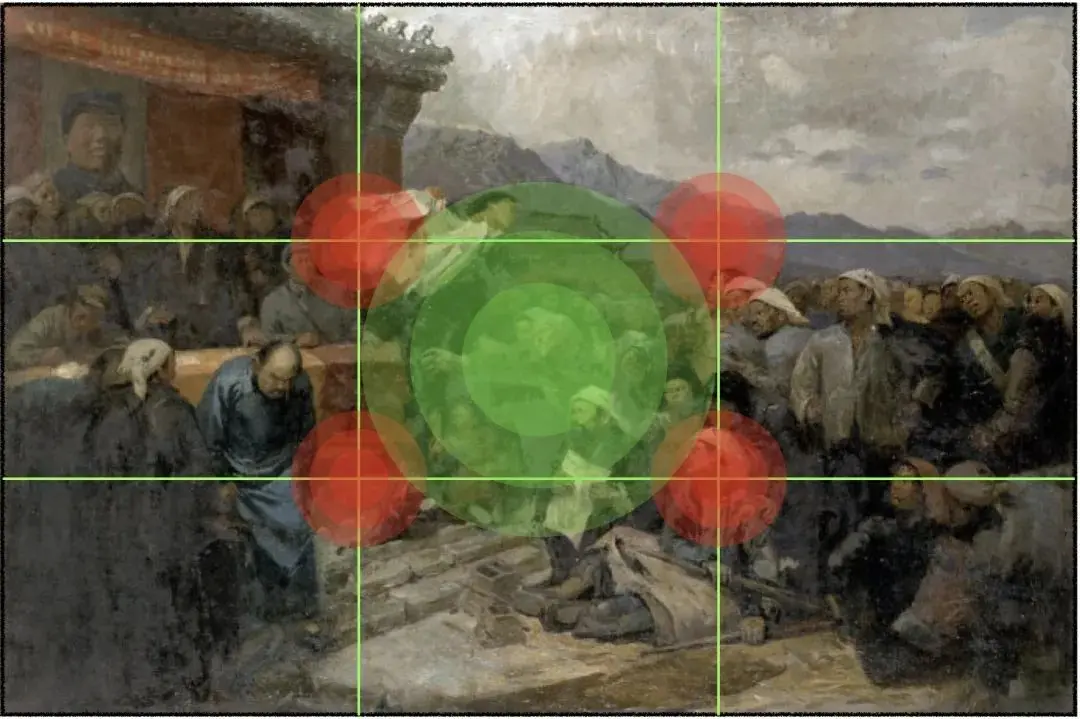 这幅由国内知名画家「王式廓」所创作的《血衣》,运用的就是「九宫格构图」。经过对之前那些绘画作品的分析,我相信大家已经看出来了,这幅画同时还是一个「向心式构图」。