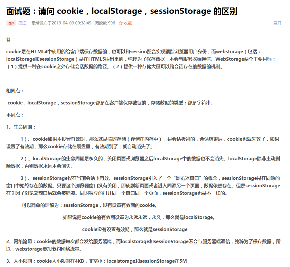 二、localStorage、sessionStorage 和cookie的区别