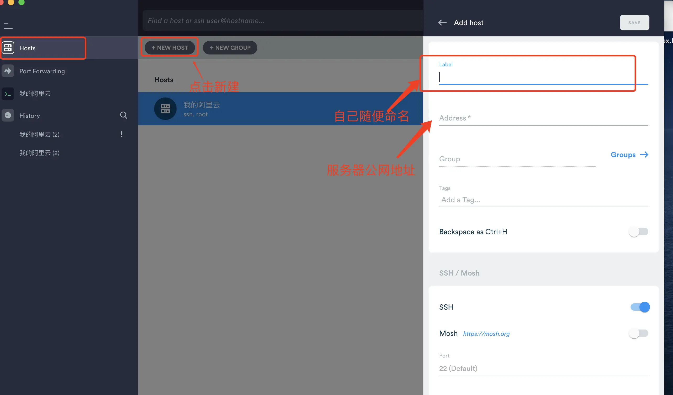 下载完成后打开Termius,新建host,具体步奏见下图: