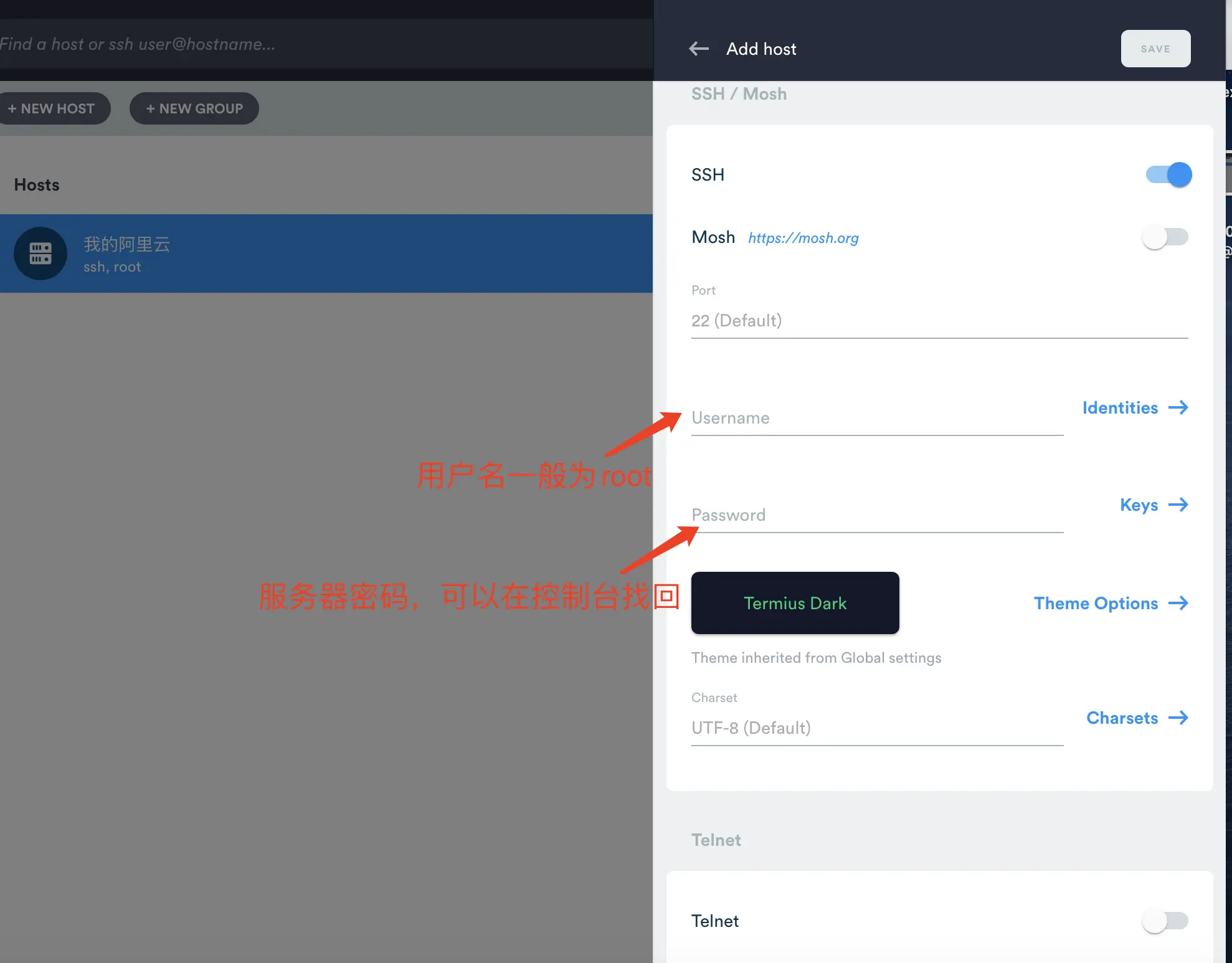 我不喜欢终端去直接连接服务器,所以借助其他工具,推荐使用Termius,网上类似工具很多,全凭个人喜好去选择。