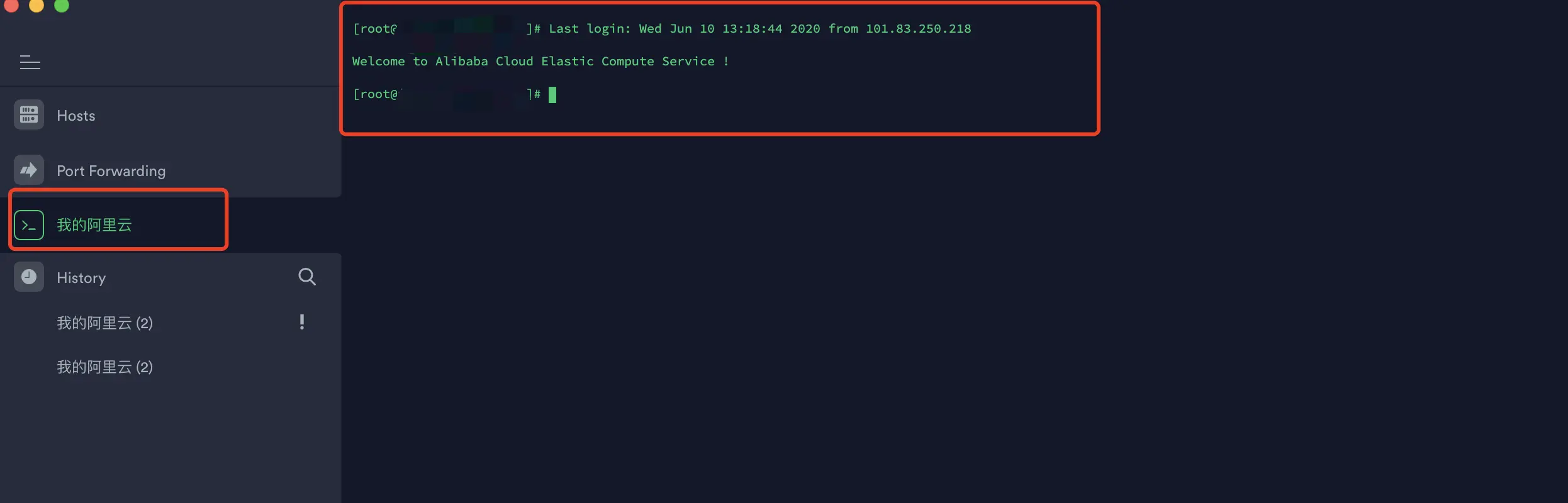 新建完成后会在host下看到新增的服务器,点击connect via SSH 进行连接,如多次连接不成功可尝试重启服务器以及阿里云控制台中远程连接查看结果,连接成功后如下图: