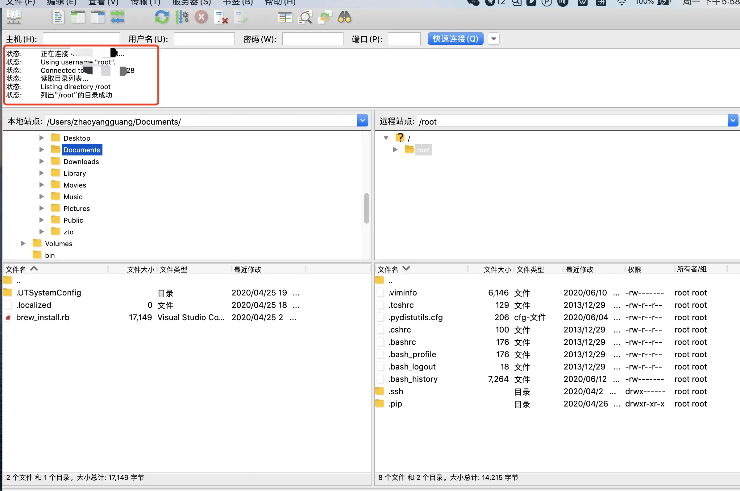 连接完成后会显示成功界面,左侧为本地文件目录,右侧为服务器目录