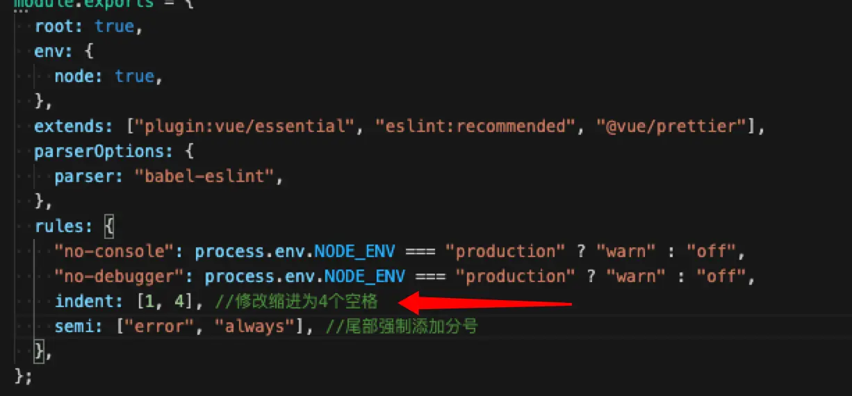 到了这一步4个空格确实有效果,你可以测试一下,但有两个问题,一是这个配置对vue文件中的html和style里的代码无效。二是你会发现JavaScript代码在两个空格和四个空格之间不停摇摆,因为官方给的配置里@vue/prettier默认是两个空格,和我们的配置起了冲突。 解决办法一就是删除.eslintrc.js文件里的@vue/prettire(不推荐)。方法二就是在根目录里添加.prettierrc配置文件。然后添加配置: