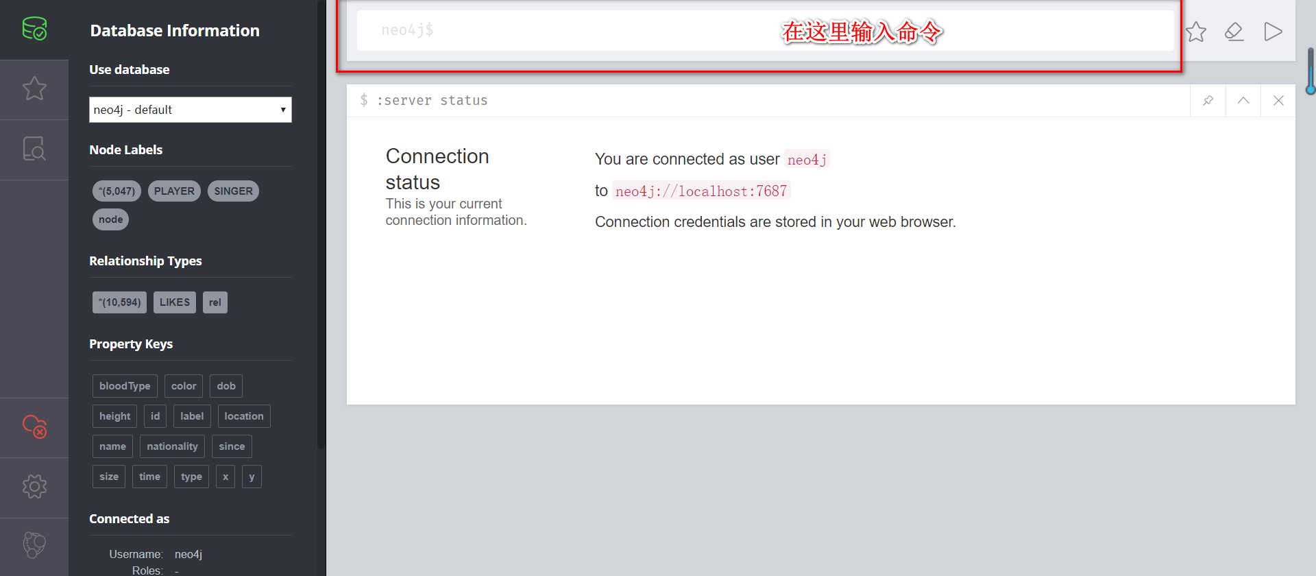localhost:7474或者127.0.0.1:7474都可以,开启的界面需要输入初始用户名和密码,都是neo4j,之后会让用户改一次密码,改好记住就行了。可以输几个语句生成节点和关系,后面测试用也方便。
