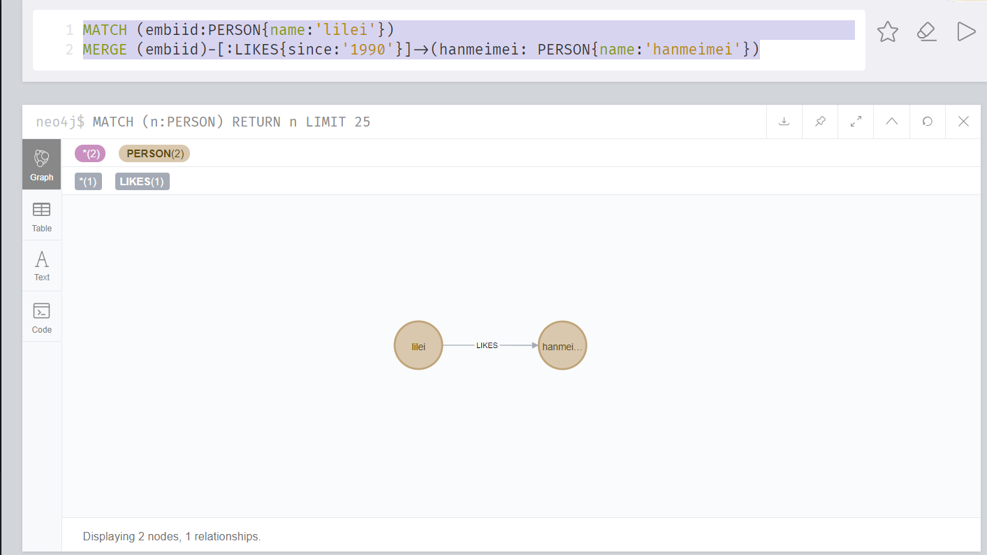 匹配lilei节点,具备关系“喜欢”,连接到(创建一个)hanmeimei节点